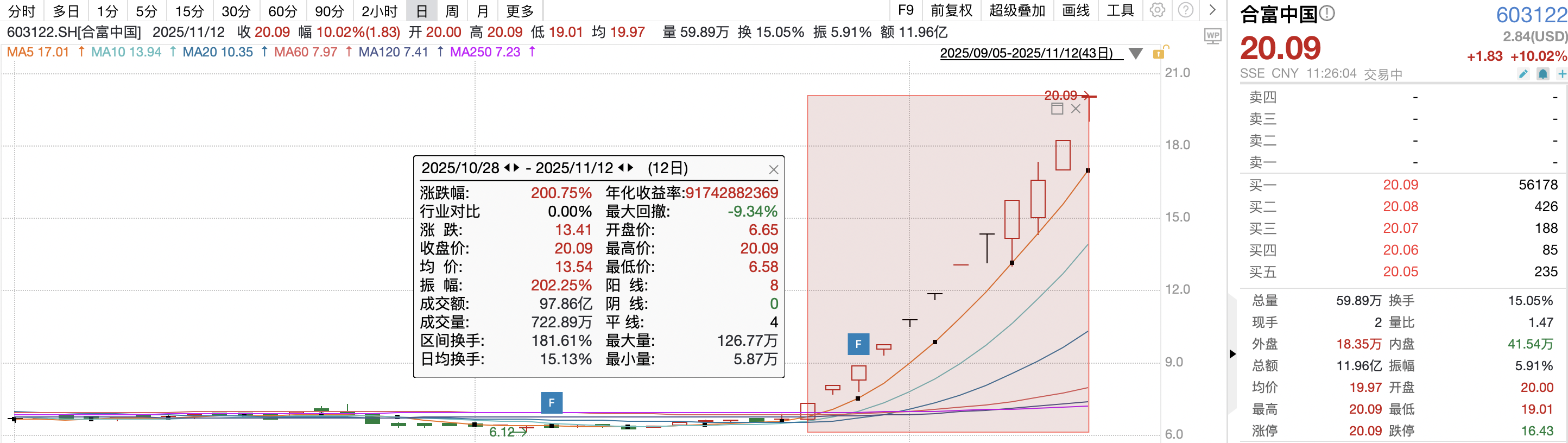 11月12日,合富中國股票開盤漲停,中間雖一度打開漲停板,但隨后再度漲停。截至午間收盤,Wind數(shù)據(jù)顯示,合富中國股票從10月28日的6.65元/股一路飆升至11月12日的20.09元/股,累計漲幅高達(dá)200.75%,總市值也從不足30億元膨脹至80億元。