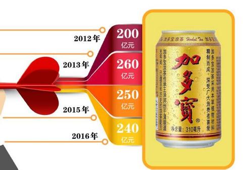 據(jù)媒體此前報(bào)道,2015年加多寶的銷售額在250億元左右。另外,加多寶在2017年3月的一次公開(kāi)會(huì)議上表示其2016年的銷售收入是240億元。而內(nèi)部人士透露,加多寶2017年的銷售總收入預(yù)計(jì)在150億元左右。