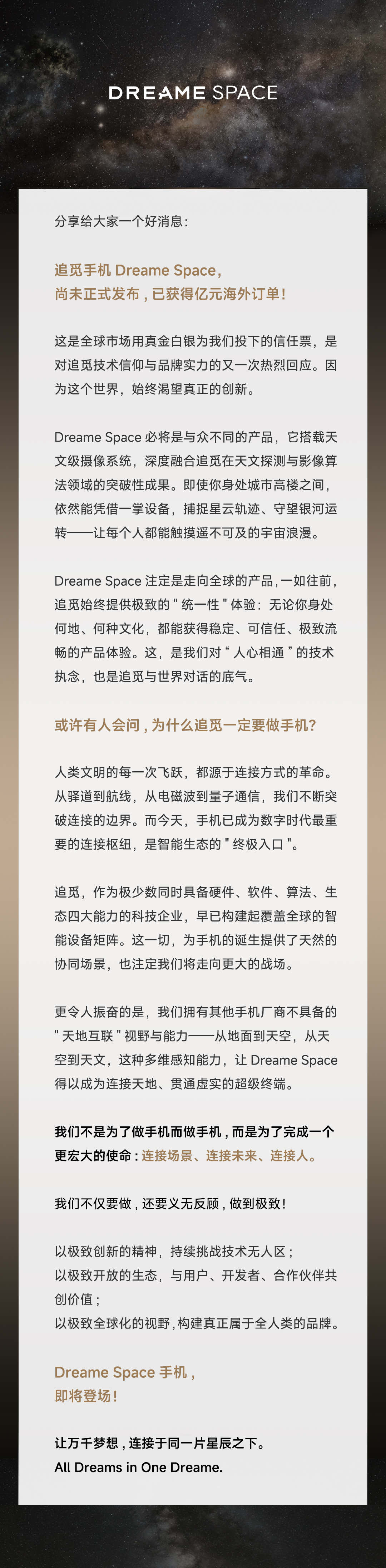 Dreame Space定位高端旗艦,在保障高端綜合體驗(yàn)的同時(shí)還帶來了“天文攝影”這一區(qū)別同類產(chǎn)品的核心賣點(diǎn),踐行追覓的創(chuàng)新理念,以此試圖重新定義智能旗艦手機(jī)的標(biāo)準(zhǔn)。