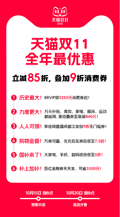 今年天貓“雙11”,官方立減85折基礎(chǔ)上,再疊加9折消費(fèi)券、行業(yè)品類券、購物金等。六大核心權(quán)益不容錯(cuò)過,應(yīng)領(lǐng)盡領(lǐng),用滿最劃算。