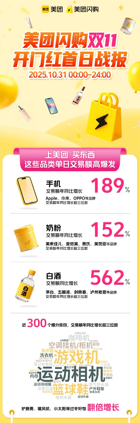 手機(jī)、白酒、奶粉等近300類商品銷量同比增長超100%:手機(jī)銷量同比增長2倍;白酒銷量同比增長超5倍。大量傳統(tǒng)電商品類和新品類商品在美團(tuán)閃購“雙11”賣爆:運(yùn)動(dòng)相機(jī)、黃金、運(yùn)動(dòng)鞋服、游戲機(jī)、筆記本電腦等銷量同比增長均超10倍。