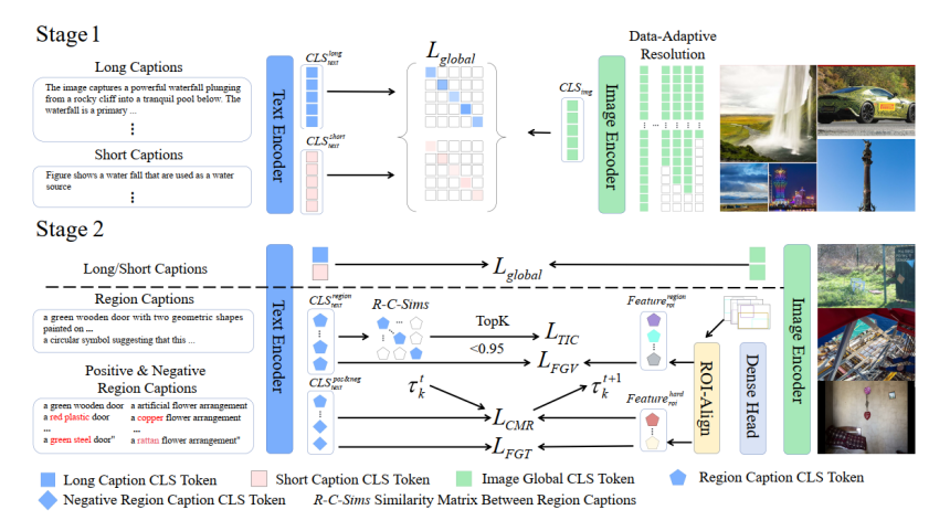 在訓(xùn)練方法上,模型采用了革命性的兩階段策略。其關(guān)鍵的第二階段摒棄了傳統(tǒng)CLIP的“整體對(duì)整體”的粗放對(duì)齊模式,升級(jí)為“局部對(duì)局部”的精細(xì)對(duì)齊,這正是其實(shí)現(xiàn)細(xì)粒度理解的精髓所在。