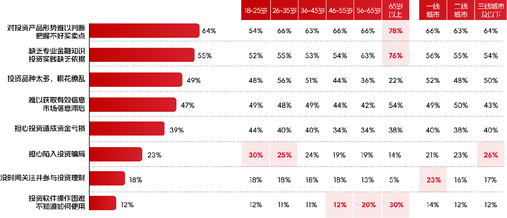 與這些簡單問題形成鮮明對比的,是散戶投資者普遍存在的行為特點。中央財經(jīng)大學(xué)中國財富管理中心的專項調(diào)查提供了詳實的數(shù)據(jù)支撐:64%的投資者表示對投資產(chǎn)品形勢難以判斷,把握不好買賣點;55%的投資者坦言缺乏專業(yè)金融知識,投資實踐缺乏依據(jù);49%的投資者面對琳瑯滿目的投資品種感到眼花繚亂;47%的投資者苦于難以獲取有效信息,市場信息滯后;還有39%的投資者始終擔憂投資造成資金虧損。